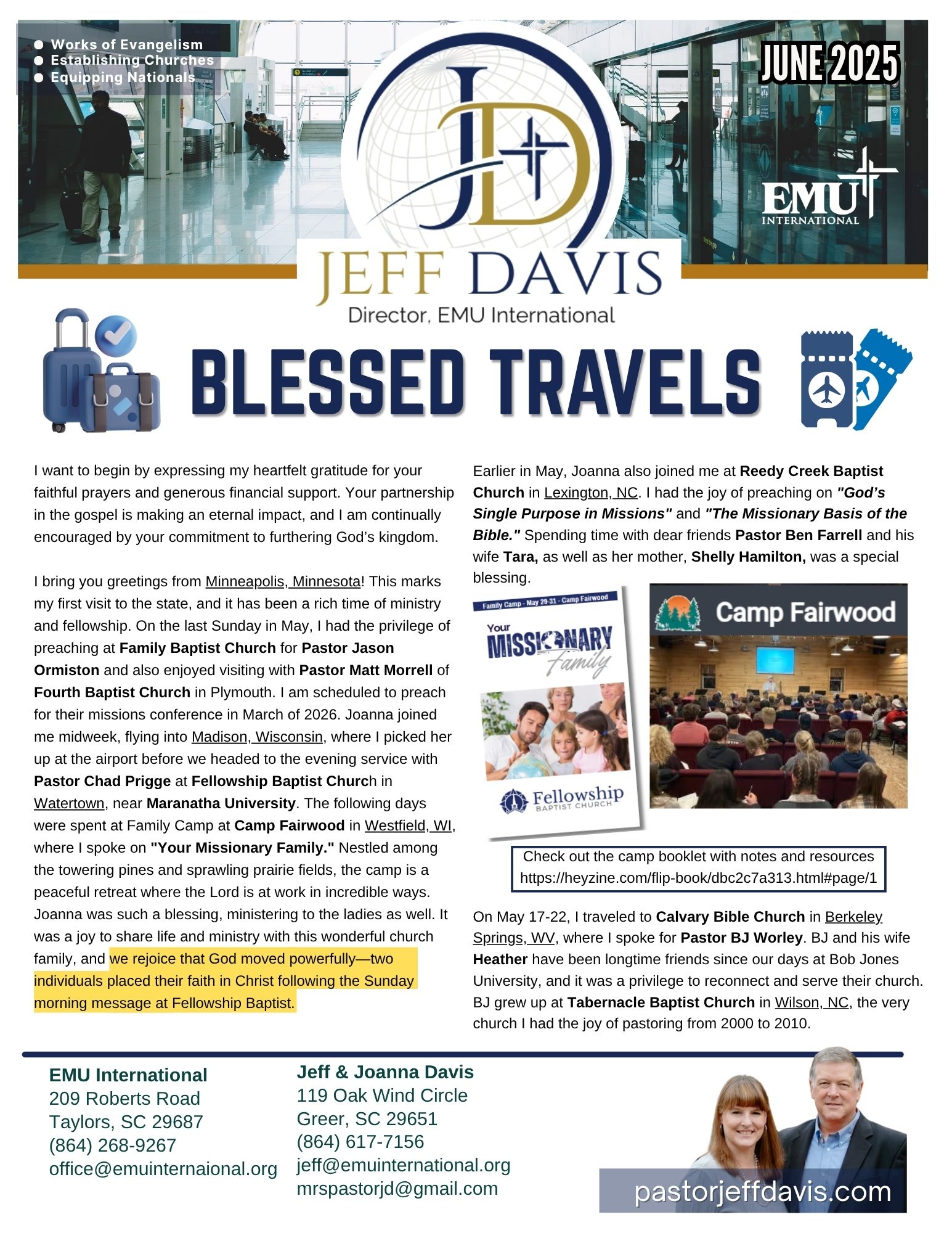 I am currently planning my calendar for 2025. I would love the privilege of visiting your church and sharing how God is using the ministry of EMU International around the world. If you are interested in me visiting your church, please email me at jeff@emuinternational.org.