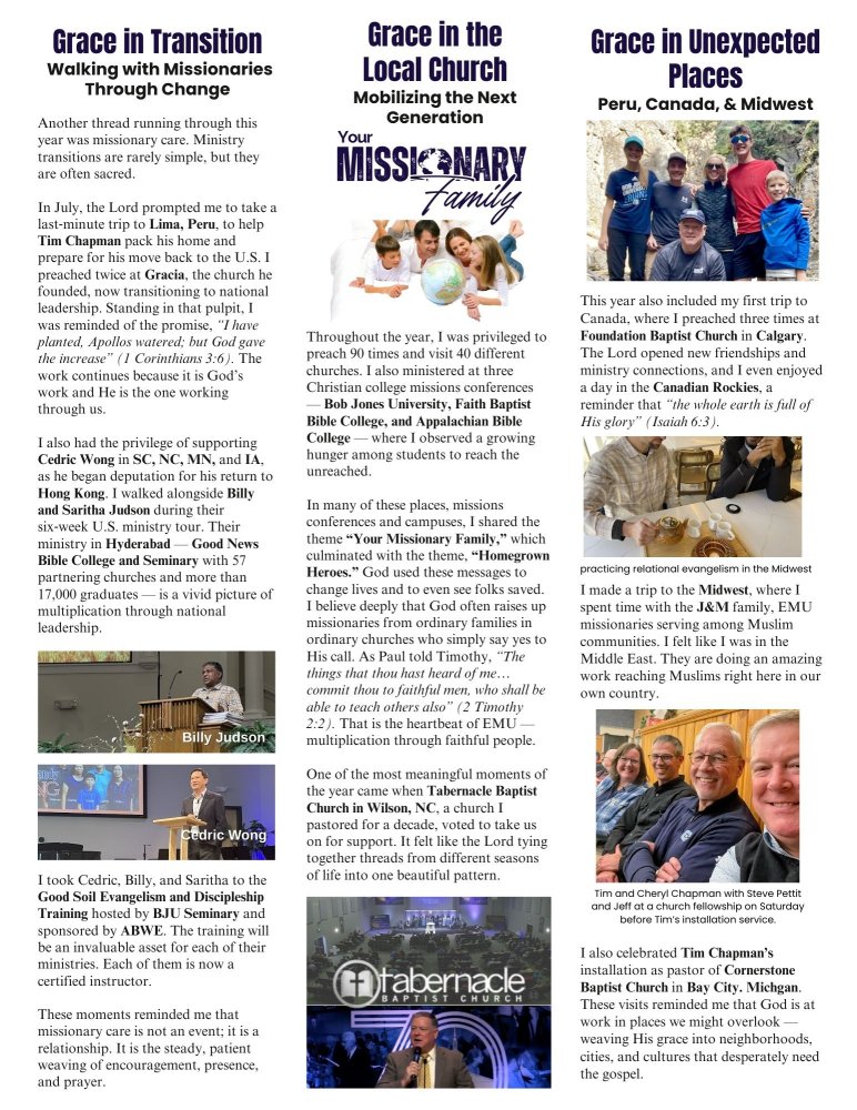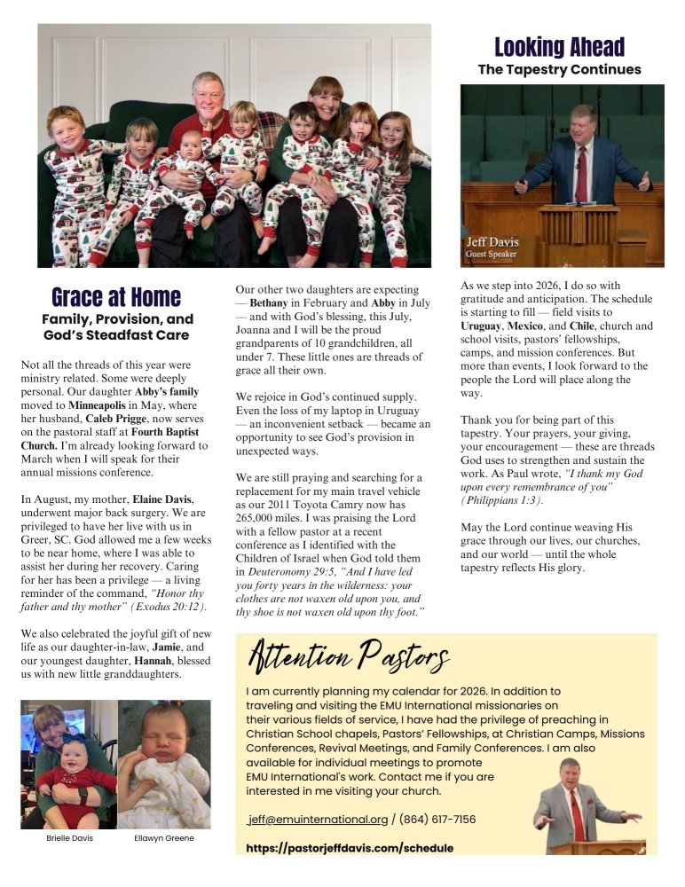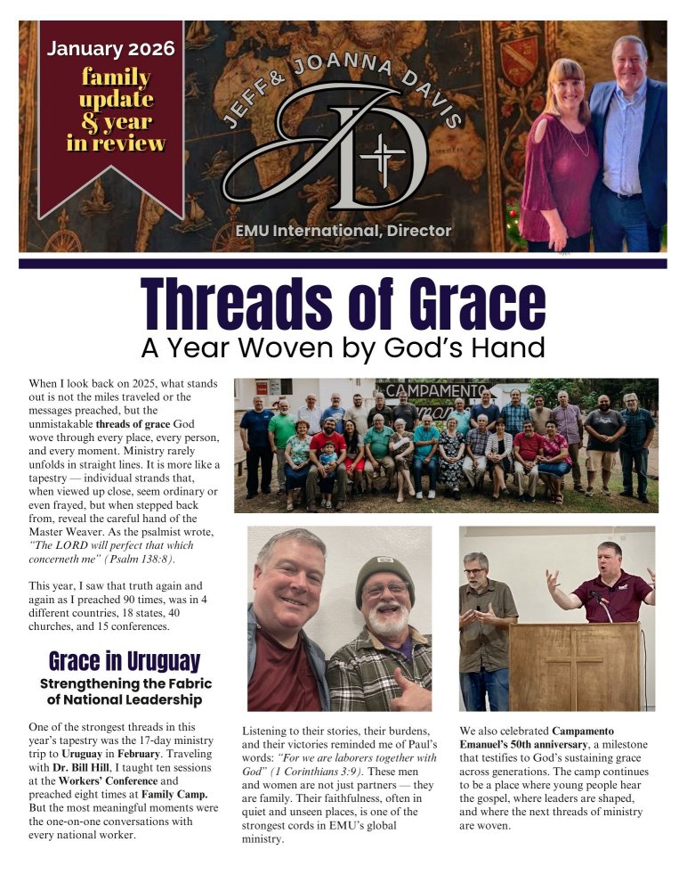 I would love the privilege of visiting your church and sharing how God is using the ministry of EMU International around the world. If you are interested in me visiting your church, please email me at jeff@emuinternational.org.